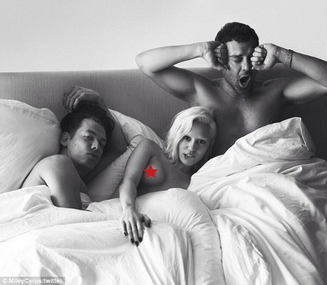 Τη φωτογραφία την ανέβασε η ίδια η Cyrus στο twitter της καλύπτοντας μάλιστα «από ντροπή» το ακάλυπτο στήθος της με ένα κόκκινο αστεράκι.